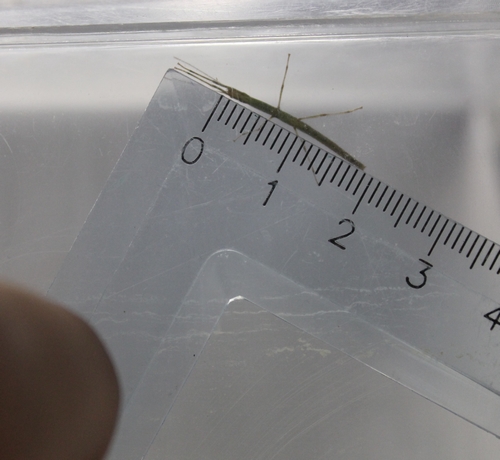 Au bout de 4 jours, nous pouvons déjà remarquer que le phasme a grandit: il mesure désormais 19 mm. Sa longueur a donc augmenté de 5 mm. Nous remarquons aussi la présence d'une "mue". Le phasme semble s'être débarassé de son ancienne "peau" un peu comme les serpents... Voir photo ci-dessous.