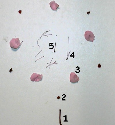 1: le pédoncule, 2 un sépale, 3: un pétale, 4: des étamines, 5: le pistil